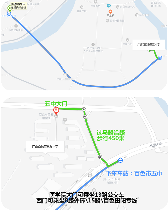 (三)到百色市第五中学的考生路线:校门→1、2、3号教学楼→校门。