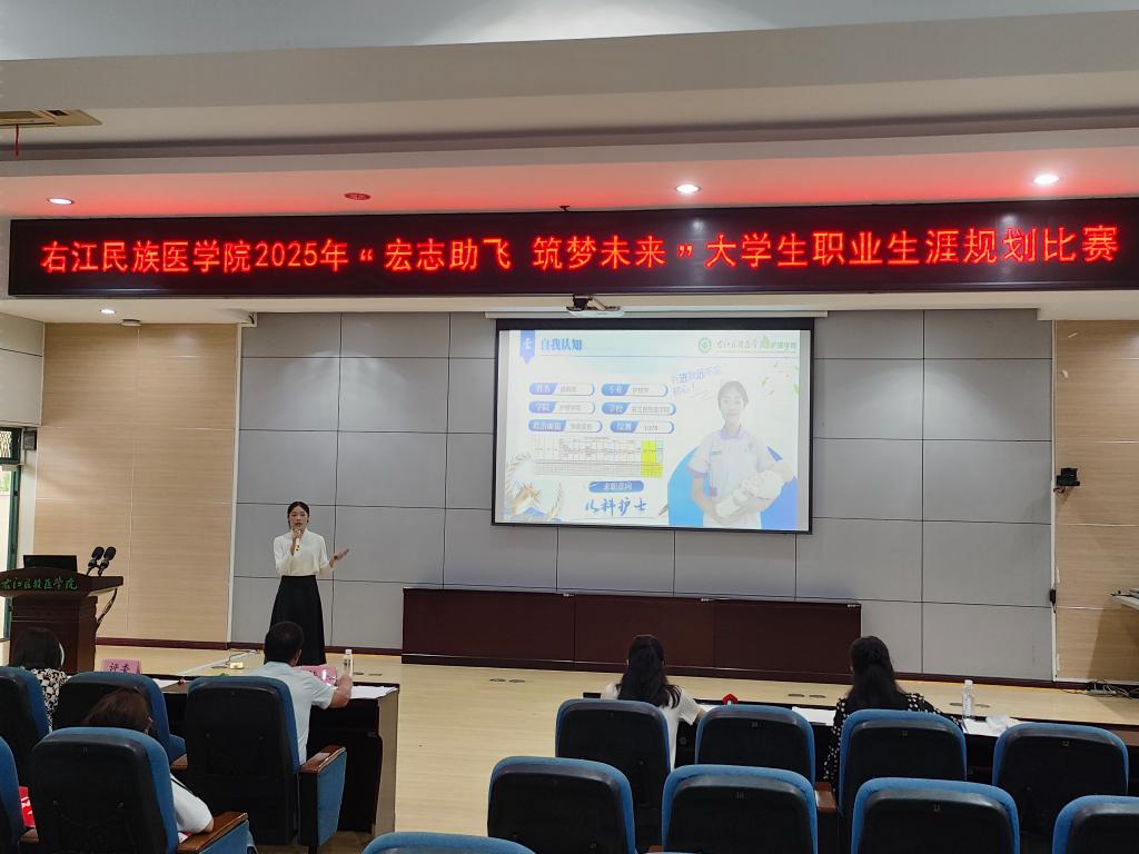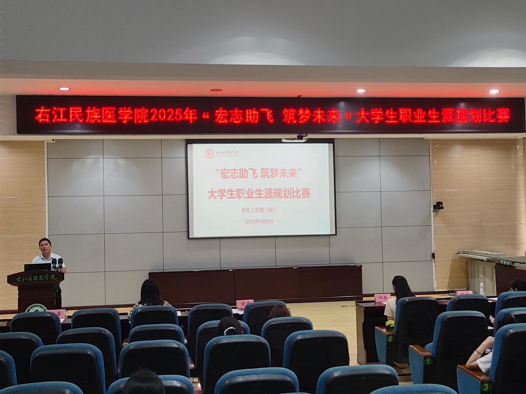 为贯彻落实《自治区教育厅关于举办2025年广西“宏志助飞 筑梦未来”大学生职业生涯规划比赛的通知》(桂教资助〔2025〕10号)文件精神,深入贯彻落实国家资助政策,引导获奖助学生树立科学的职业生涯规划理念,完善“发展型资助”模式,提升资助育人工作效能,党委学生工作部于6月8日在百城校区5-101报告厅举办2025年“宏志助飞 筑梦未来”大学生职业生涯规划比赛校赛,党委学生工作部部长梁旭明、校团委、人事处、学生个人成长赛道参赛选手,党委学生工作部相关科室成员参与此项比赛。