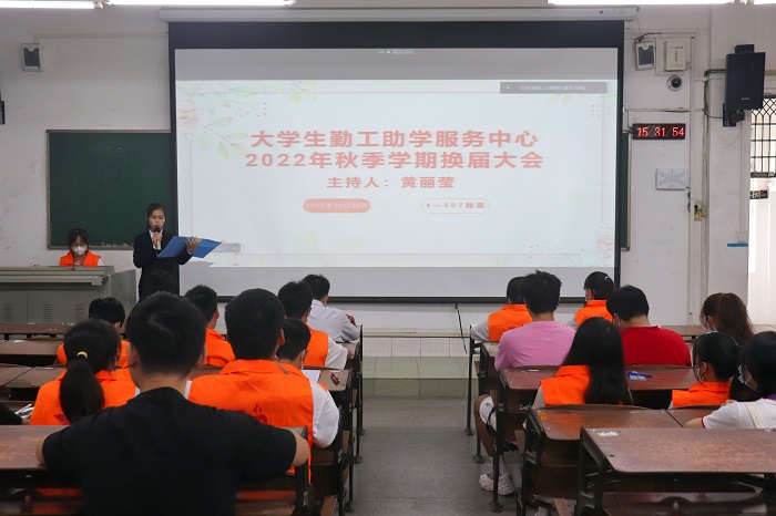 2022年10月30日下午,大学生勤工助学服务中心在4栋507教室举行秋季学期换届大会。按照校园疫情防控要求,本次换届大会采取线上线下同时进行的模式。学生工作处邱勇强副处长、学生资助管理办公室李水琴老师、大学生勤工助学服务中心全体成员以及上一届卫生岗工作积极分子在线下参会,新一届卫生岗在线上参会。本次换届大会由主席部副主席黄丽莹同学主持。
